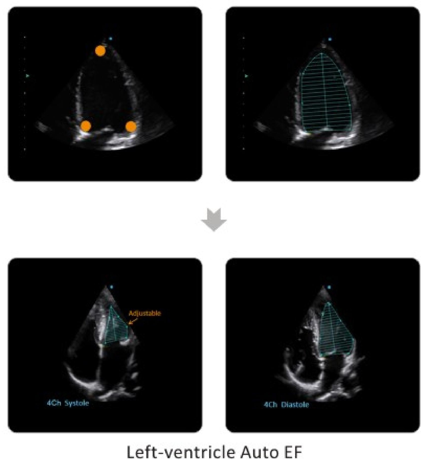 By setting 3 points of the left-ventricle (systolediastole), system can automatically track the edge of myocardium, calculate the LV volume and output function